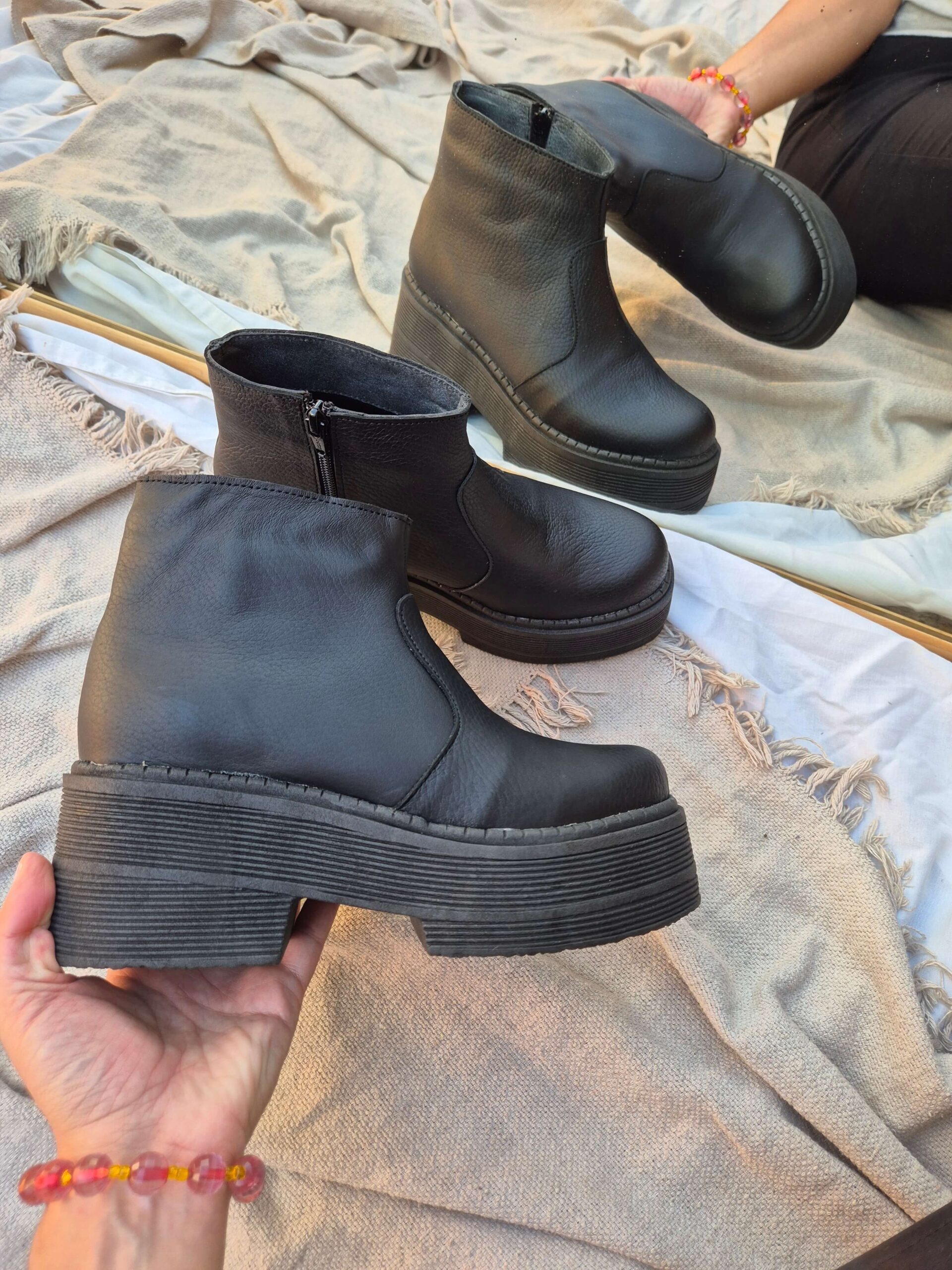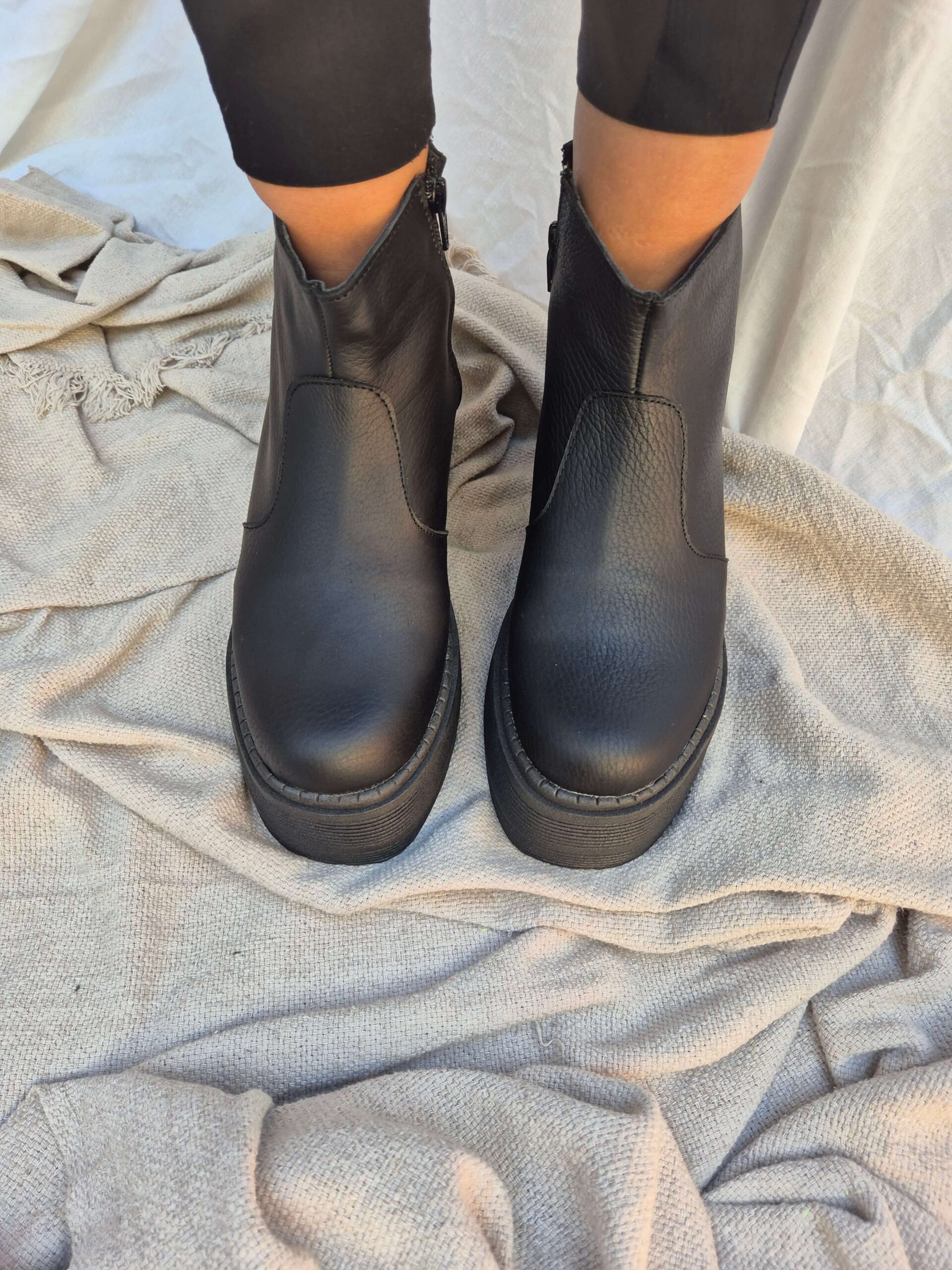 Nuestro modelo Barce está hecho en cuero argentino de color negro, con un cierre en el lado externo para un ajuste seguro. Su base -también negra- cuenta con una plataforma de 4 cm y un taco de 6 cm, brindando altura y estilo sin sacrificar la comodidad. Estas botas son ideales para lucir sofisticada y a la moda, sin renunciar al confort en cada paso que des. ¡Un clásico imprescindible en tu armario!