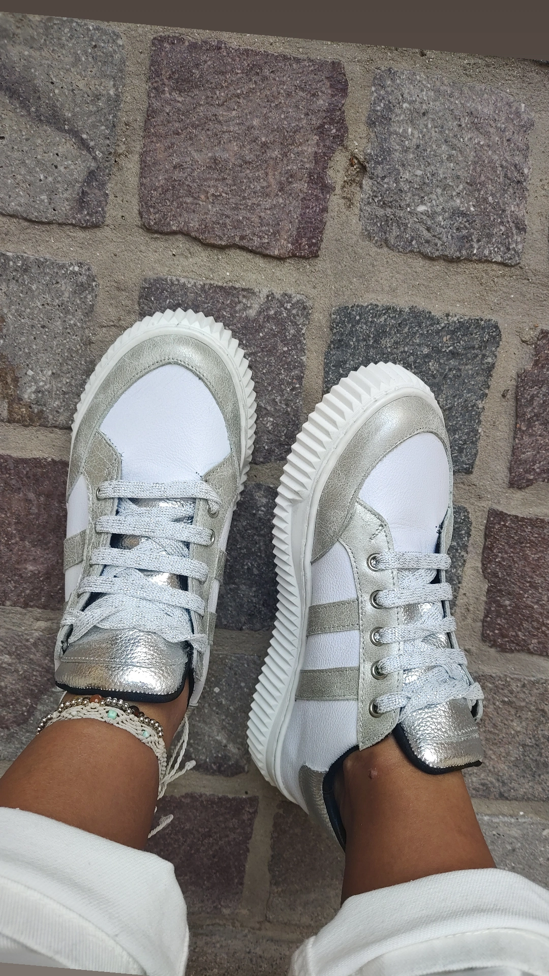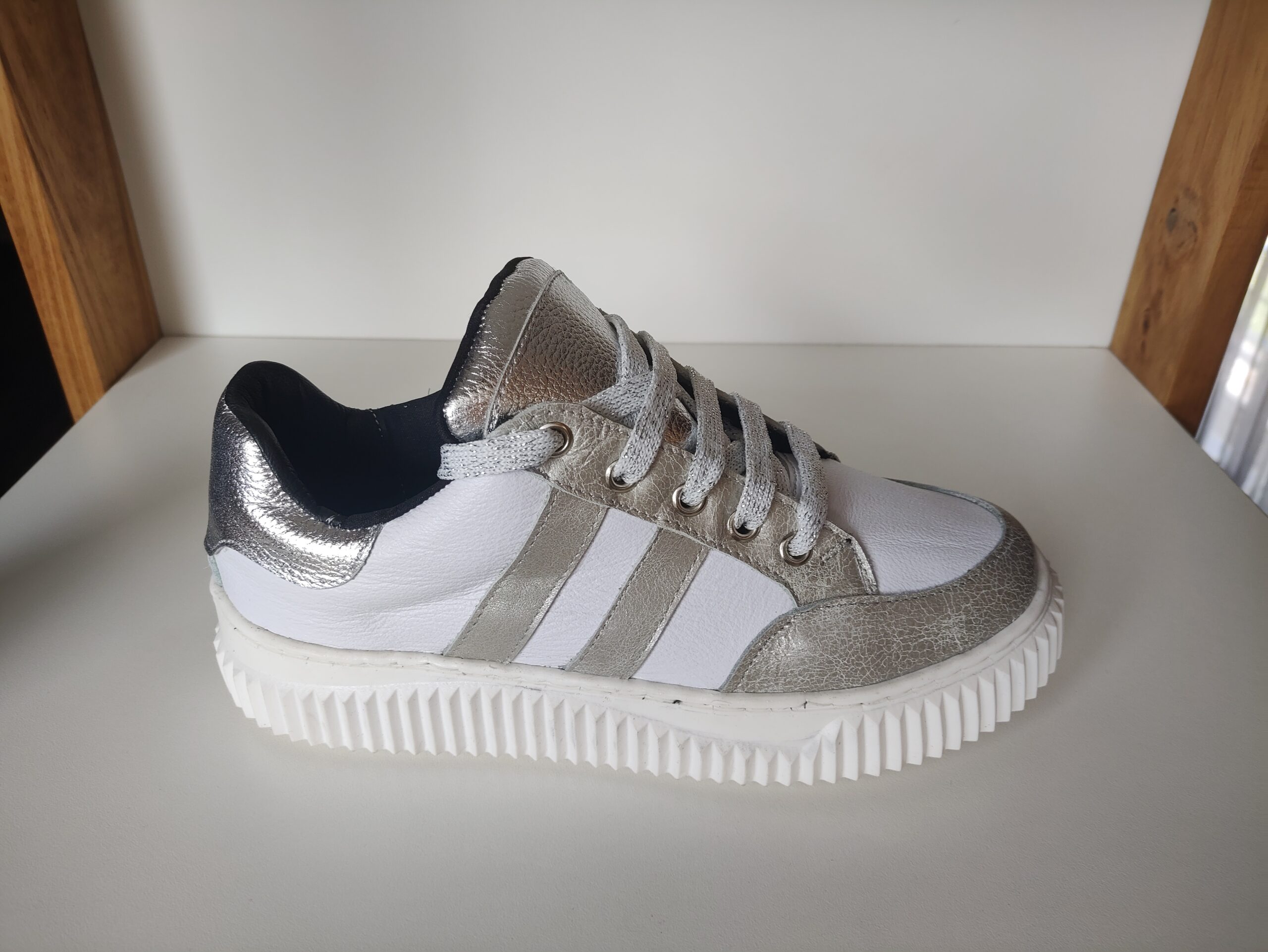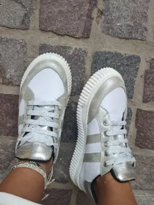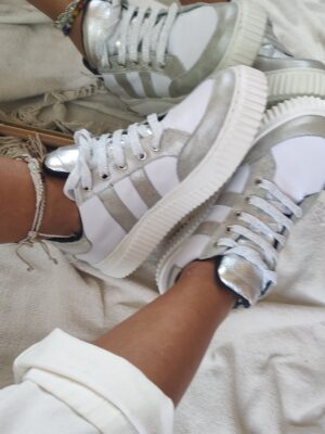 Zapatilla de Cuero. Combinamos varios colores para hacerlas únicas y adaptables a cualquier outfit. Tiene cuero blanco y un plata gastado. La base es de color blanca de goma. Super adherente al piso y flexibles.