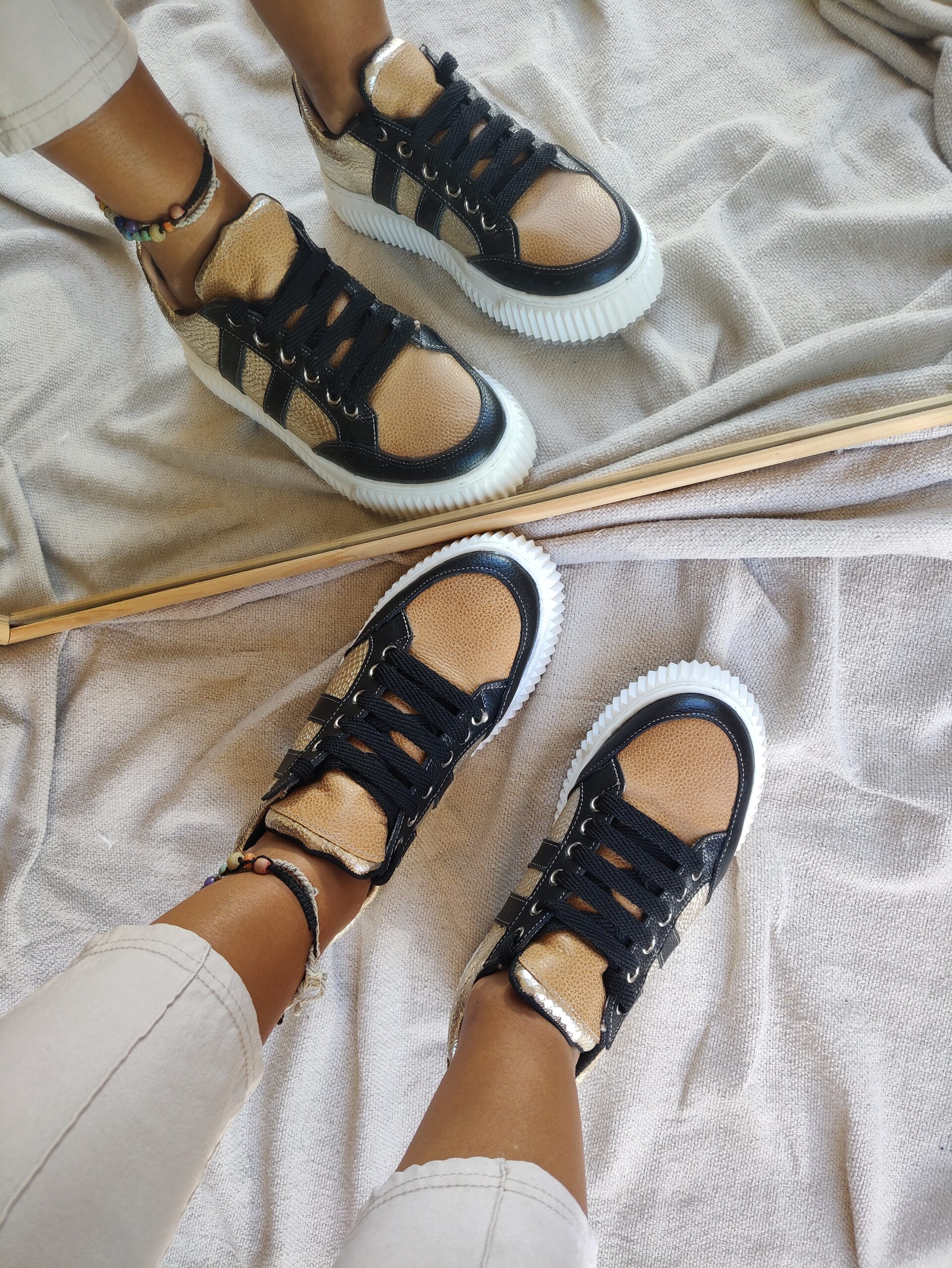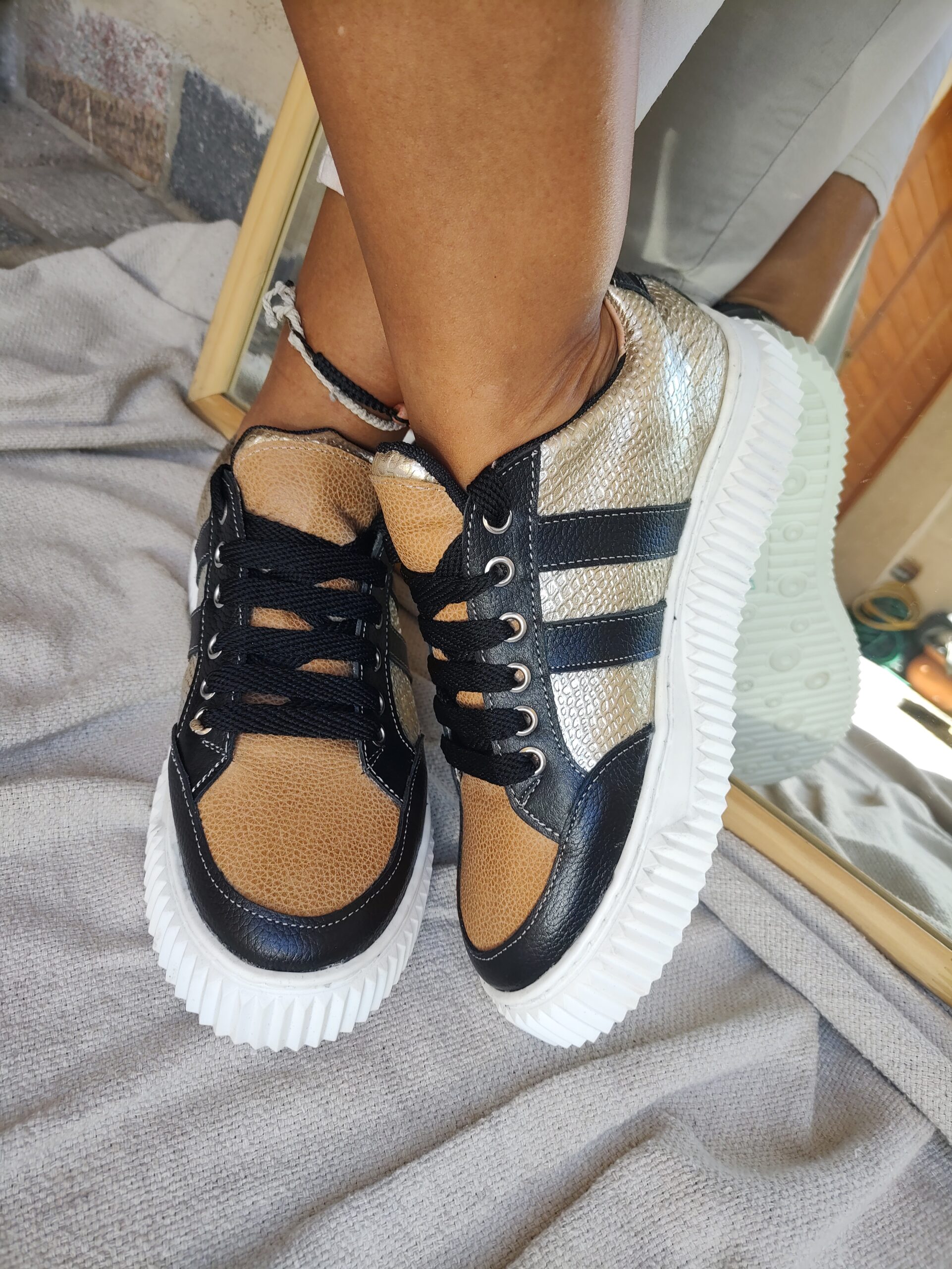 Zapatilla de Cuero. Combinamos varios colores para hacerlas únicas y adaptables a cualquier outfit. Tiene cuero negro, suela y platino. La base es de color blanca de goma. Super adherente al piso y flexibles.